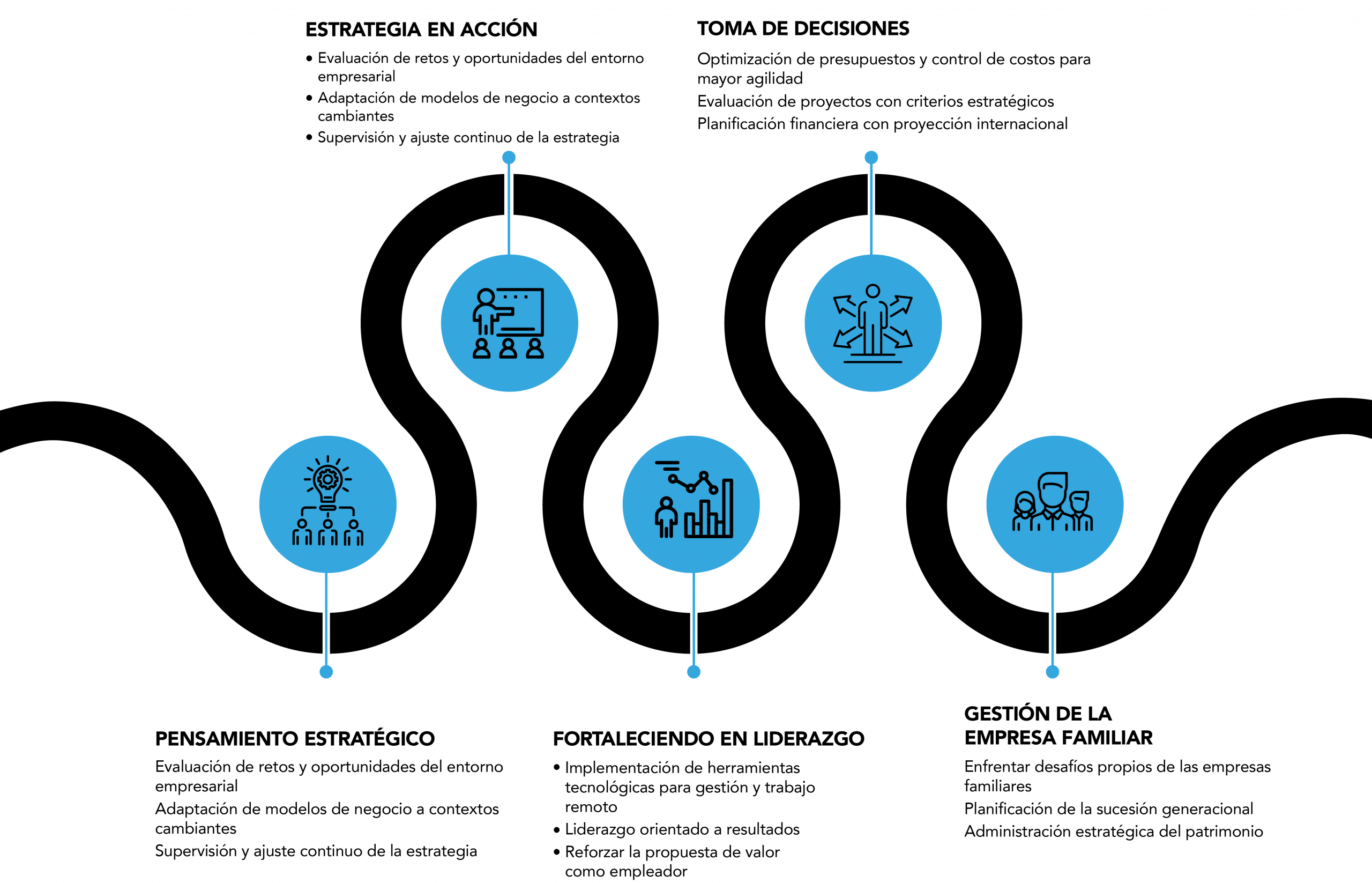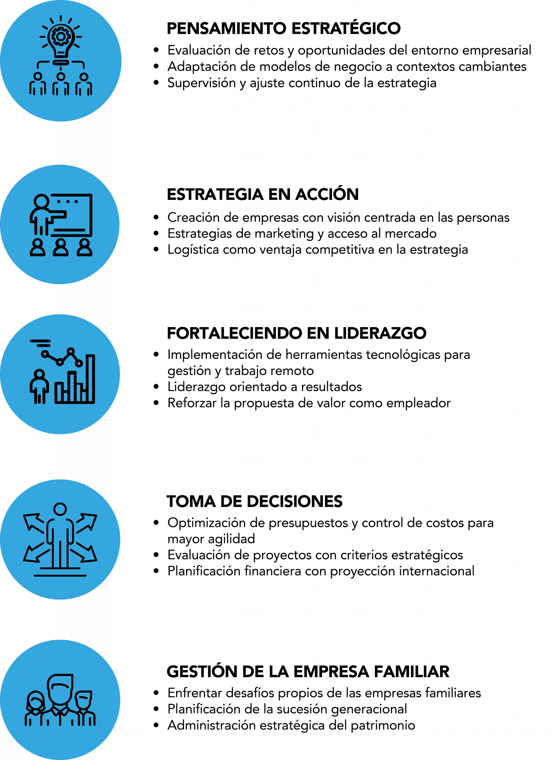 Una sólida comprensión de las mejores prácticas de gestión empresarial y habilidades avanzadas en áreas clave como estrategia, finanzas y liderazgo.